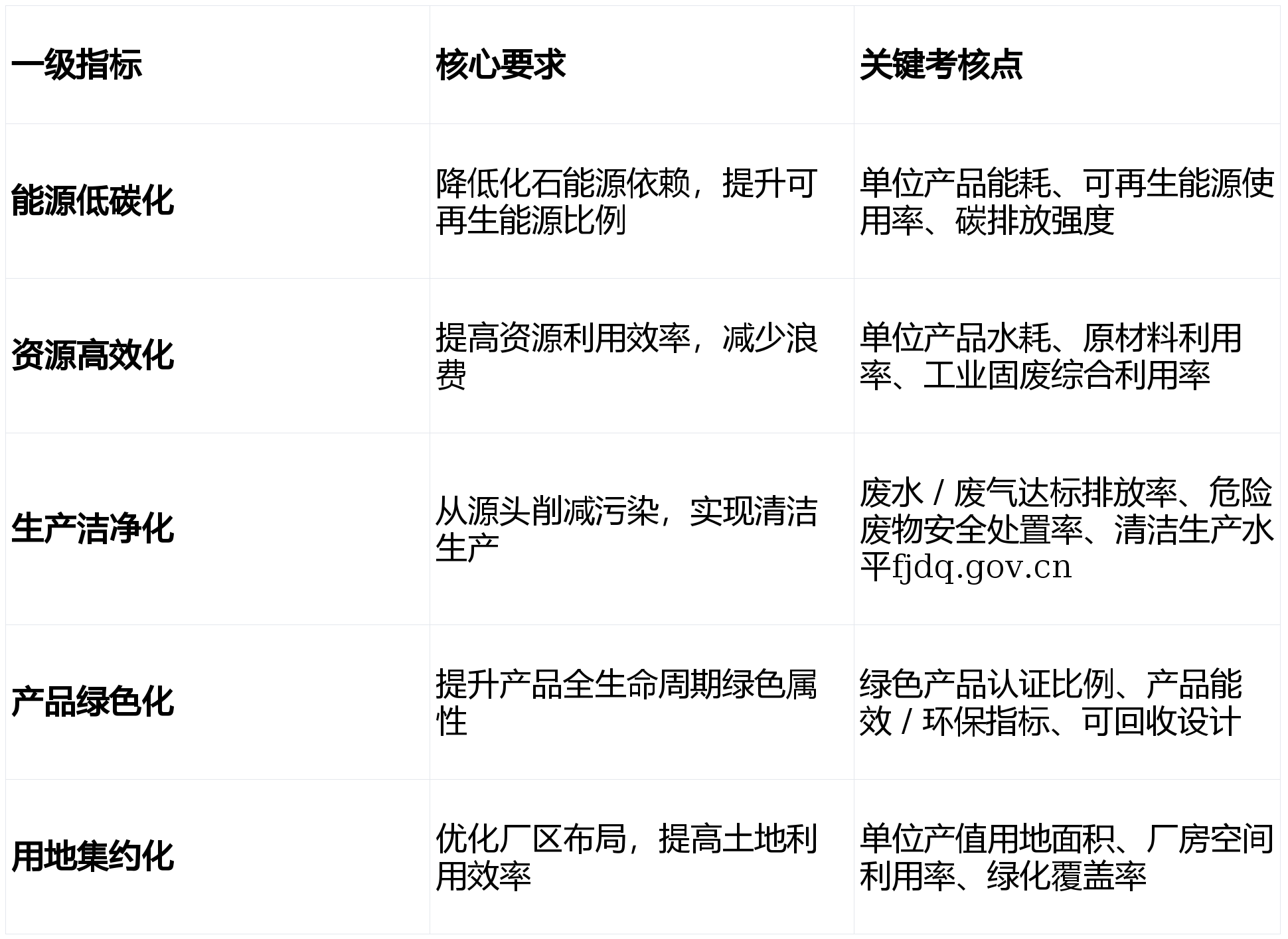 新版《绿色工厂评价通则》(GB/T 36132—2025)大幅简化评价体系,设置5 项一级指标、14 项二级指标,更加聚焦核心绿色要素: